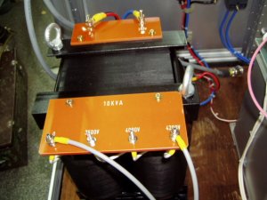 これが単相用10KVAトランス | 三相一次側入力端子台 | 単相一次側端子台 |