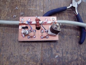 ケースに入れて見通しが立ちました | 思い切って基板化にしました、C結合に注目 | 中心はテフロンパイプに1.6mm |