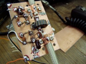 最初はピックアップ平行ビニール線で構成 | コアや巻き方も色々研究しました | C結合は両面基板を切って製作 |