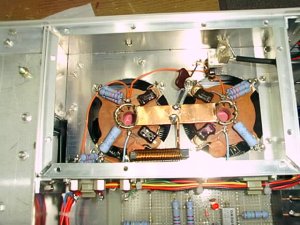 RF部には、いつもながらの銅板を張りました | VCの軸をリンセイドウ板でGnd、これもノウハウ | 配線が終わった裏の面 |