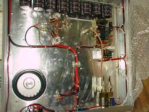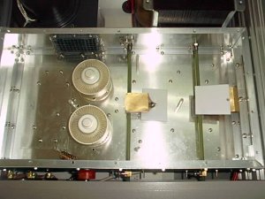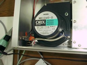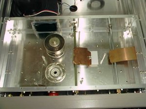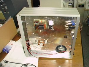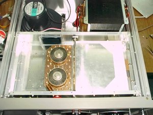 ファンの回り込みで配線にシールドしましたが | トランスを乗せる前です | 吹き出し口に網を張りました |