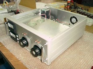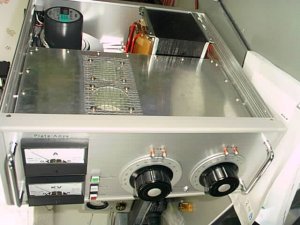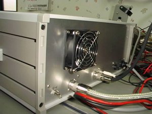 完成した430MHzAmp、ケースも初採用です | ファンはトランスを、冷却 | 完成後の最終テスト中です |