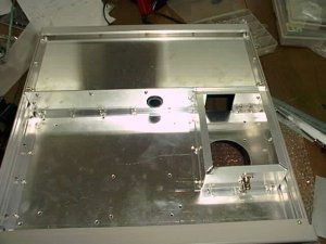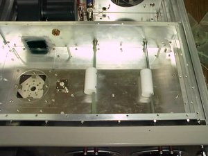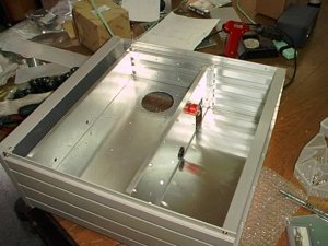 背面ファンは、トランス冷却用 | シャーシ加工の途中 | 共振板、合わなくて後で両サイド切りました |