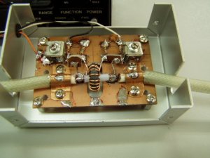 ケースに入れて見通しが立ちました | 思い切って基板化にしました、C結合に注目 | 中心はテフロンパイプに1.6mm |