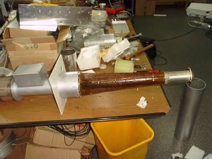 周波数補正アミを外すと何とパイプ焼け | ボロボロになりこの部分で漏れていた | 下から30φ、無誘導、50φ、周波数補正 |
